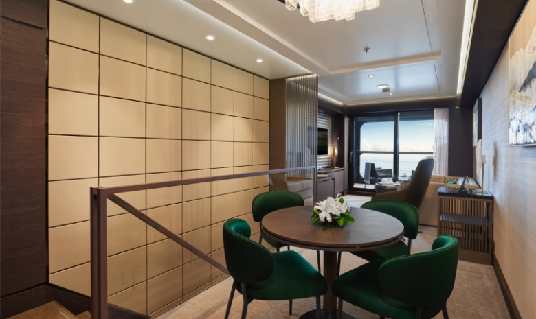 ACCOMMODATIONSBed & BathPowder room on the upper levelDouble vanity master bathroom with modern soaking tub and separate shower on the lower levelLuxury custom king bed sleep system on the lower levelCustom luxury bed and bath linensSuite FeaturesInnovative two story suite with entry from both levelsPrivate, spacious terrace overlooking the ocean on the upper levelLuxurious and modern living and dining area on the upper levelConvertible sleep sofa on the upper levelSizeSuite: 611 SQ FT | 57 SQ MTerrace: 81 SQ FT | 7.5 SQ MSERVICES AND AMENITIES24-hour in-suite diningLuxury bath amenities & individual robe and slippersComplimentary Wi-FiComplimentary chilled bottle of champagne upon arrivalEspresso machine with complimentary coffee and teasDigital flat screen televisionIn-suite safeVanity mirrorHair dryerHypoallergenic pillows, upon request230v and 120v outlets, as well as USB charging capabilitiesSUITE HIGHLIGHTSMAGNIFICENT OCEAN VIEWSPrivate, spacious terrace overlooking the ocean on the upper levelPicture window on the lower levelSPACIOUS SUITE ACCOMMODATIONSInnovative two story suite with entry from both levelsLuxurious and modern living and dining area on the upper levelLuxury custom king bed sleep system on the lower levelDouble vanity bathroomPERSONALISED SERVICE AND AMENITIESThe Personal Concierge is your single onboard touch point to ensure a flawless, seamless journey from beginning to end24-hour in-suite dining, espresso machine, complimentary coffee and teas and a mini-bar provisioned to your preferences