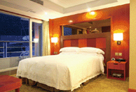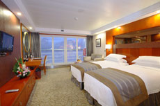 Stateroom size: 260 sq. ft. Hotel-style beds 79 inches x 35 inches (with optional twin-bed configuration) Panoramic windows that open onto private veranda Private bathroom with shower and premium bath products Bathrobe and slippers available upon request Telephone, refrigerator, safe, hair dryer & bottled water replenished daily Kettle and instant coffee available in the stateroom Air conditioning Space under bed for storing suitcases Roomy wardrobe with wooden hangers Voltage: 220V and 110V in stateroom TV with premium entertainment package including CNN and other English-language programming